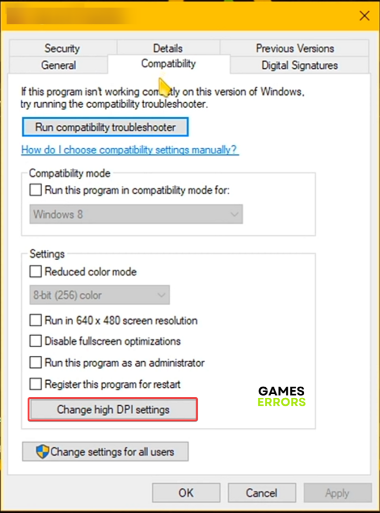 5. をクリックします互換性タブ、クリックします高DPI設定を変更します