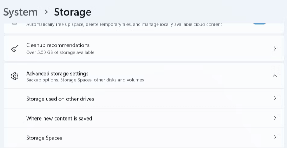 ステップ3:選ぶ新しいコンテンツが保存されています次の隣のドロップダウン矢印をクリックして、コンテキストメニューから高度なストレージ設定。
