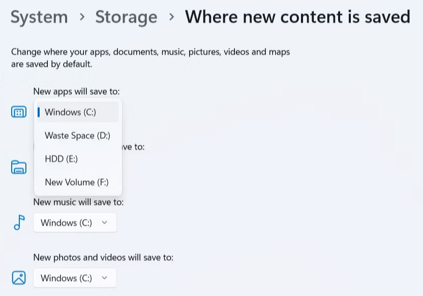 ステップ4:次のようにドロップダウンメニューを選択して、ゲームをインストールするドライブを選択します新しいアプリは保存されますセクション、クリックします適用する。