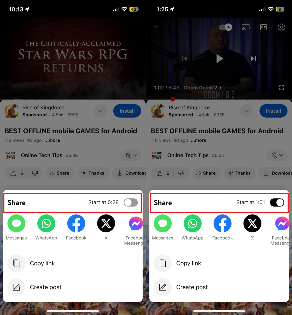 YouTubeには、共有シートにタイムスタンプトグルがあります。ユーザーは、共有ボタンを押した正確なポイントで再生を開始するビデオを共有できるようになりました。タイムスタンプのトグルには、「HH:MM:SS」ラベルでの開始」ラベルがあり、HH、MM、およびSSはそれぞれ時間、分、2番目を表します。