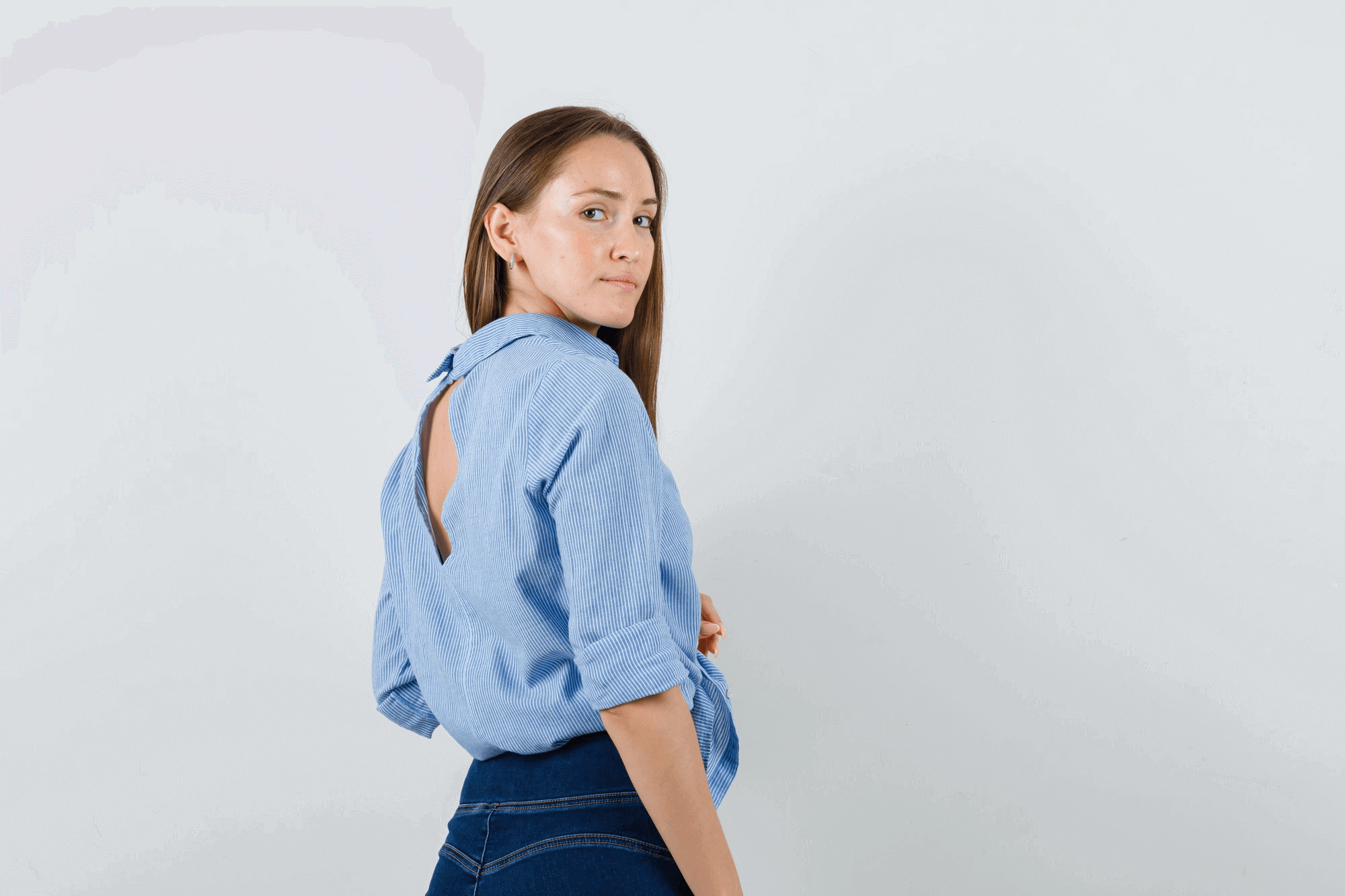 このヘッドショットポーズは、プロの写真に使用されます。俳優やモデルに最適です。カメラに背を向けて肩越しに見ると、目と表情に焦点が置かれるからです。