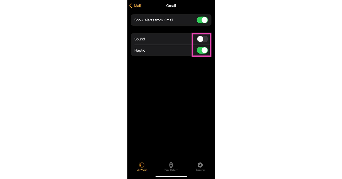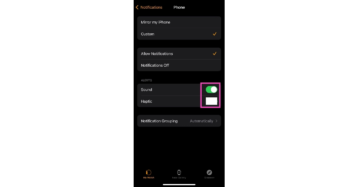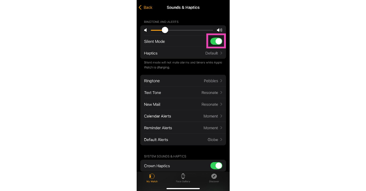 Apple Watchのサウンドアラートが必要ない場合は、設定>サウンド&ハプティックsそして、サイレントモードのためにトグルスイッチをオンにします。これは触覚アラートをオフにしません。