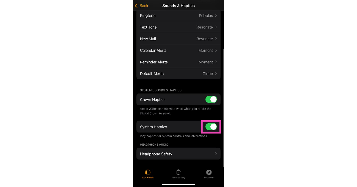 Apple Watchは、「Haptic Alerts」がオフになるとすぐに振動を停止します。行きます設定> Sound&Haptics、そして、システムの触覚の横にあるトグルスイッチをオンにします。
