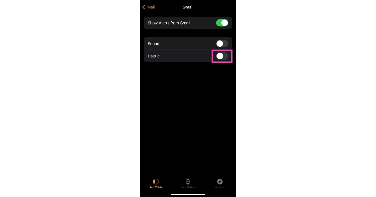 特定のアプリからの通知の振動フィードバックが必要ない場合は、iPhoneでApple Watchアプリを起動し、問題のアプリを通知設定で選択するだけです。カスタムをタップして、トグルスイッチをオフにしますハプティック。