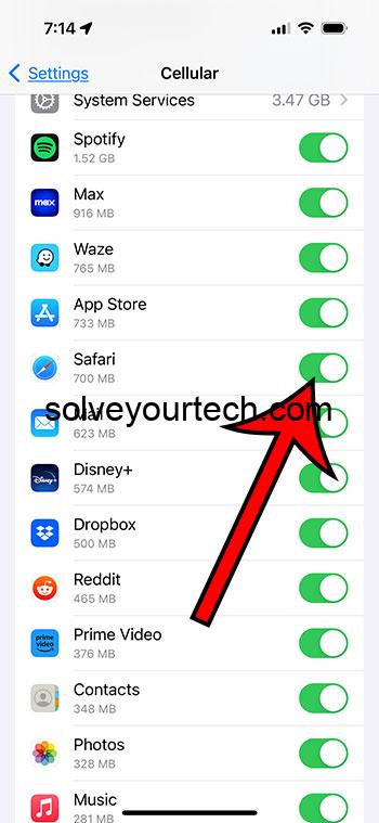 Safariの隣のトグルをアクティブにして、Safariのセルラーデータを有効にします。