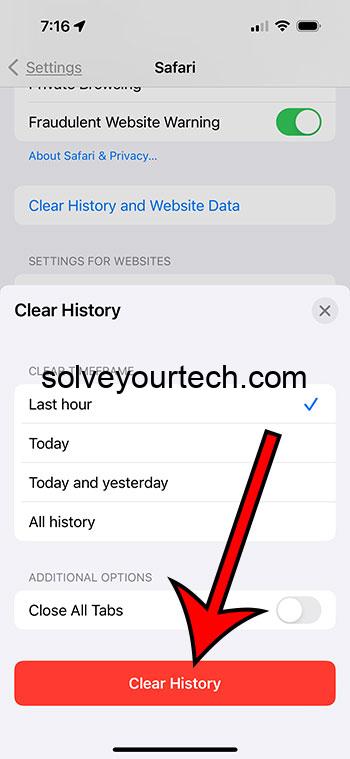 Safariの閲覧履歴とWebサイトデータを削除すると、パフォーマンスを大幅に向上させ、読み込みの問題に取り組むことができます。これを行うには、[設定]> [Safari]に移動し、[履歴とデータをクリア]を選択します。履歴とウェブサイト、Cookie、キャッシュ、およびデバイスから履歴を閲覧するためのアクションを確認してください。