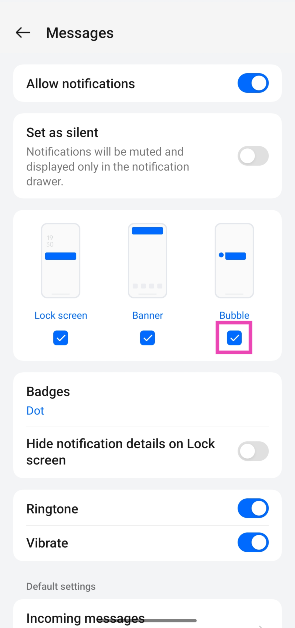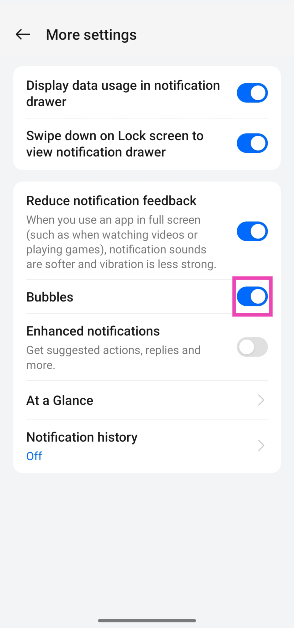 行きます設定>通知とステータスバー>その他の設定「バブル」の横にあるトグルスイッチをオフにします。