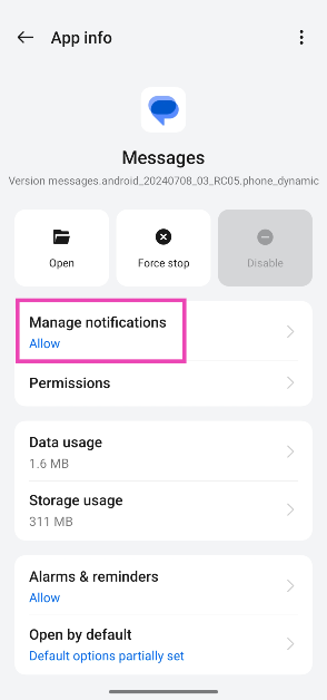 行きます設定>アプリ、アプリを選択し、[通知の管理]をタップし、「[通知を無効にする]の横にあるトグルスイッチをオフにします。