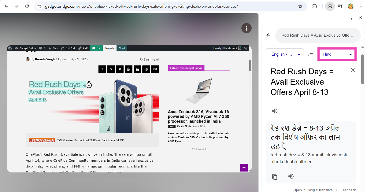 ステップ5:選択したテキストは、で翻訳されますサイドパネル。サイドバーから言語を変更できます。