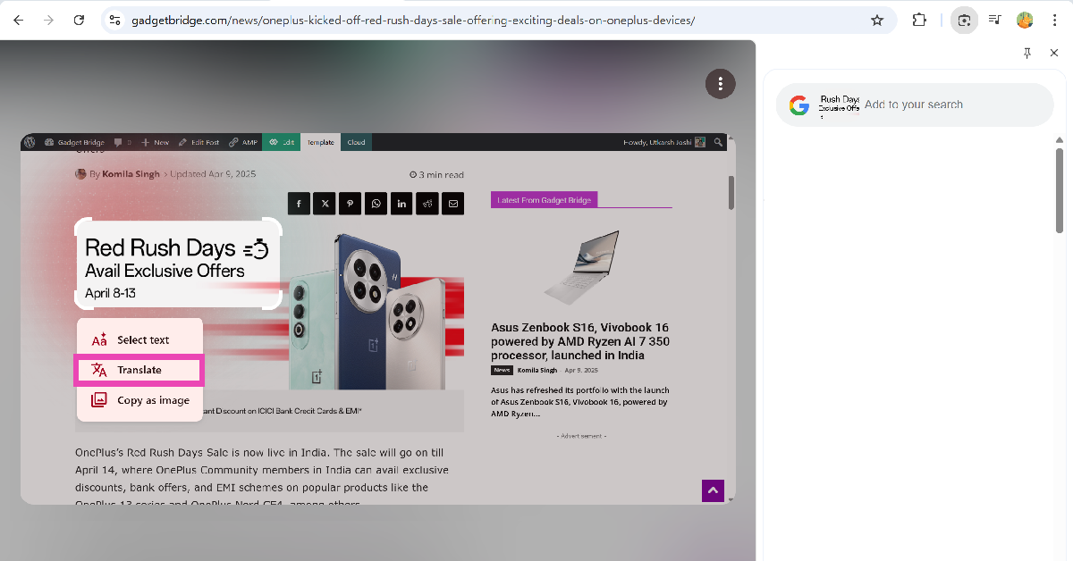 画像を含むWebサイトに移動し、Google Chromeのアドレスバーをクリックし、Googleレンズを選択し、テキストの周りに境界を描き、「翻訳」をクリックします。