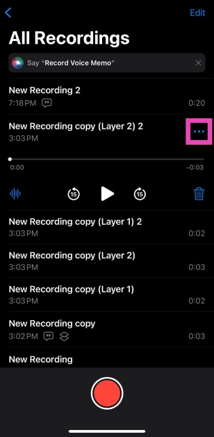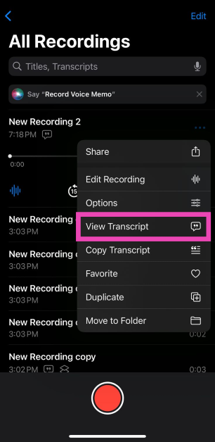 iPhoneでVoice Memosアプリを使用してオーディオ録音を作成し、録音を選択して楕円を押します。オプションのリストから[トランスクリプトの表示]を選択します。