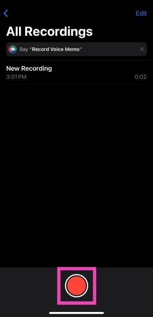 Voice Memosアプリのレコードボタンを押して、パネルをスワイプして展開し、引用符のアイコンを押してライブ転写を表示します。