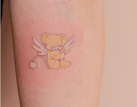 この明るいカナリアの黄色の生き物は、Cardcaptor Sakuraの主人公であるKeroです。コドナーは、このカラフルなデザインをクライアントの腕のくぼみに巧みに入れ墨し、おそらくある程度の不快感を引き起こしましたが、見事な結果は確かに価値がありました。