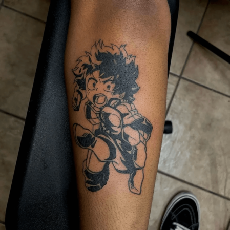 この脚のタトゥーは、私のヒーローアカデミアの主人公を美しく命を吹き込みます。燃えるようなアクションショットでレンダリングされたDekuは、究極のデトロイトスマッシュを届ける態勢を整えているようです。