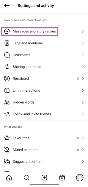 ステップ3:'まで下にスクロールします他の人があなたと対話する方法'セクションとタップしますメッセージとストーリーの返信。