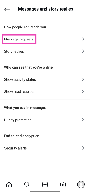 Instagramプロフィールに移動し、ハンバーガーメニューをタップして、メッセージとストーリーの返信>メッセージリクエスト。