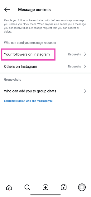 デフォルトでは、あなたがフォローしていない人からのメッセージは、リクエストフォルダーになります。これには、プラットフォーム上のフォロワーやその他のランダムアカウントが含まれます。プロファイル設定を使用すると、これらのユーザーからのメッセージを完全に制限できます。あなたが従う人(および相互のフォロワー)からのメッセージは、メインの受信トレイに直接着地します。