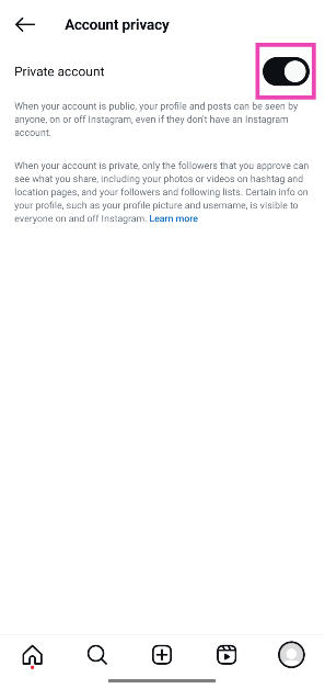 Instagramプロファイルに移動し、ハンバーガーメニューをタップし、「アカウントプライバシー」を選択し、「プライベートアカウント」の横にあるトグルスイッチをオンにします。