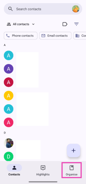 Googleの連絡先のリサイクルビンは「整理」タブにあります。