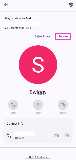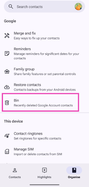 行きますGoogleの連絡先>整理> bin復元する電話番号を選択します。