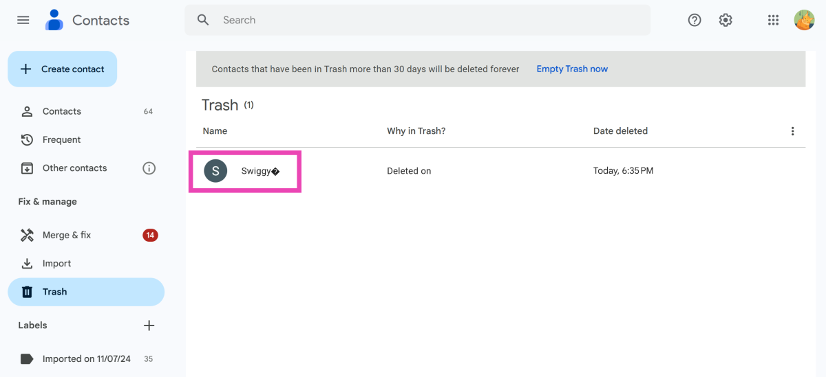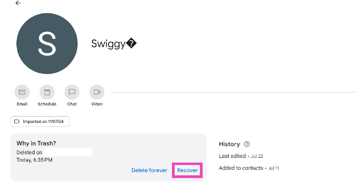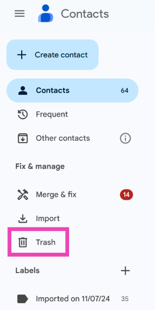 PCでGoogle連絡先Webポータルを開き、「Trash」をタップし、連絡先を選択し、「Recover」を押します。