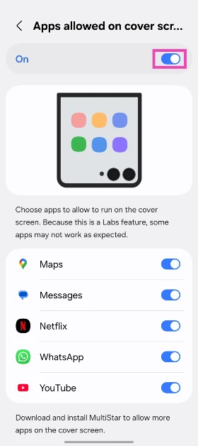 行きます設定>高度な機能>ラボ>カバー画面で許可されているアプリトグルスイッチをオンにします。スワイプダウンして、YouTubeとNetflixの隣のトグルスイッチをオンにします。それが完了すると、カバー画面で2つのアプリを使用できます。