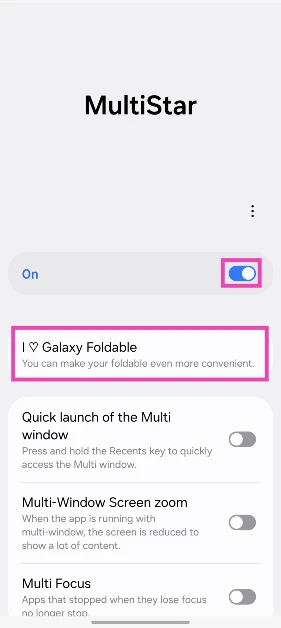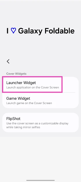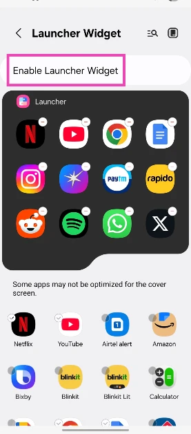 行きます設定>高度な機能>ラボまた、「カバー画面で許可されているアプリ」の横にあるトグルスイッチをオンにします。 GalaxyストアからSamsung Good Lockをダウンロードし、MultiStarプラグインをインストールします。プラグインを起動して移動しますI♡galaxy折りたたみ>ランチャーウィジェット。ホーム画面で必要なアプリを選択します。 [LauncherWidgetを有効にする]をタップし、MultiStartを選択し、「Launcher Widget」をタップします。