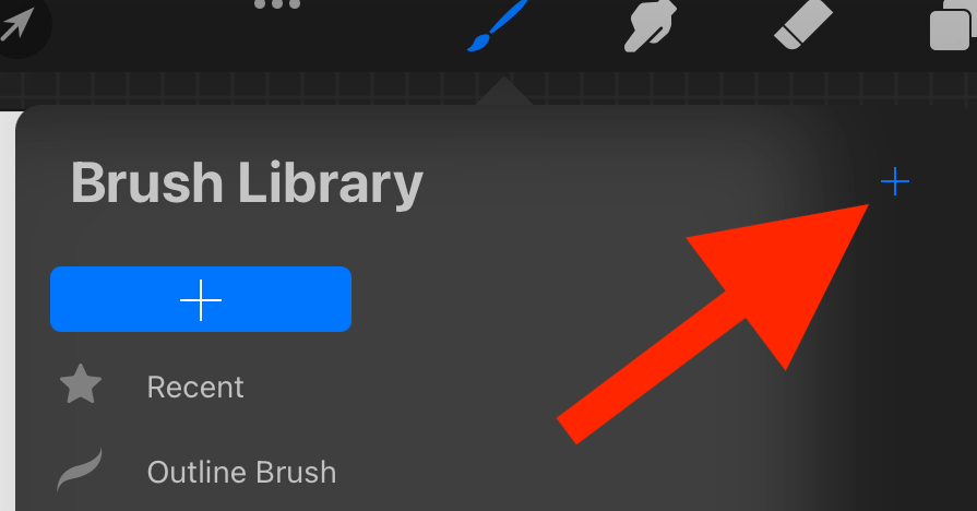 ステップ1:キャンバスの右上隅にあるペイントブラシアイコンをタップして、ブラシライブラリを開きます。ブラシライブラリのドロップダウンメニューで、の +シンボルをタップします右上隅。