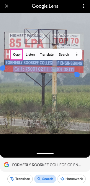 Google Photosアプリで画像を開き、下部のレンズオプションを押して、写真のテキストを選択します。ポップアップメニューで「コピー」を押します。