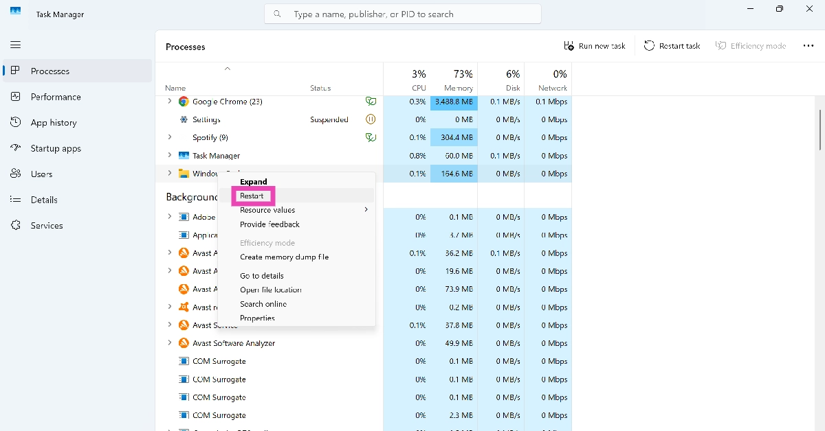 ステップ3:右クリックしますWindowsエクスプローラー選択します再起動。