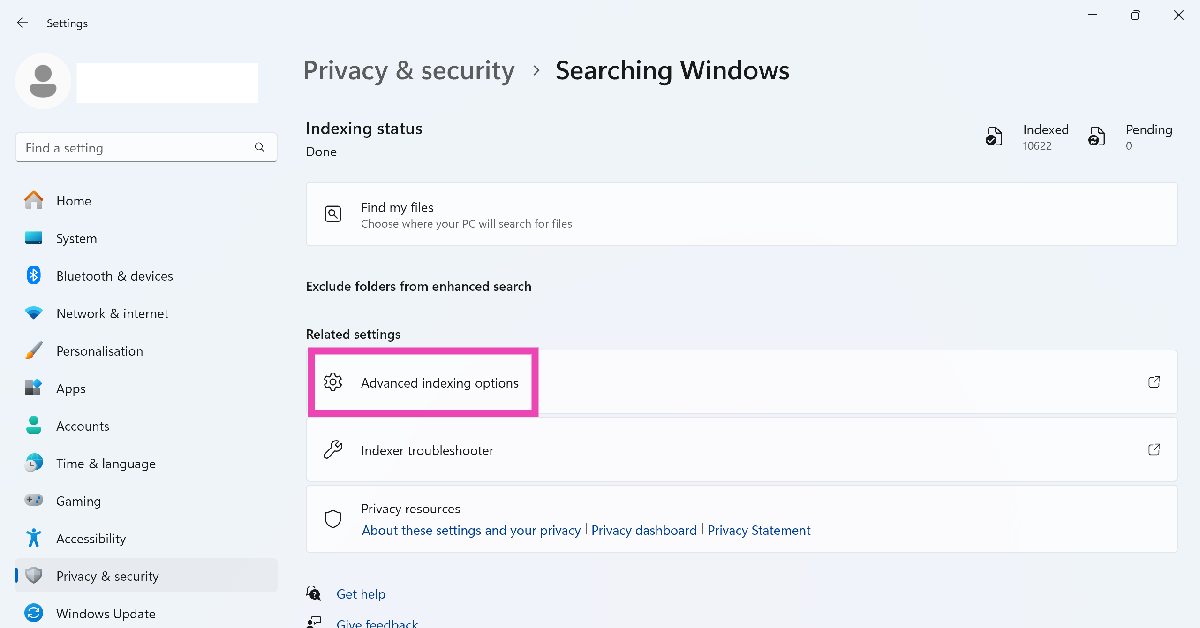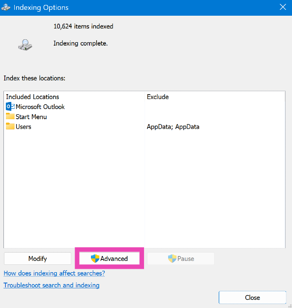 ステップ3:下にスクロールして選択します高度なインデックス作成オプション。