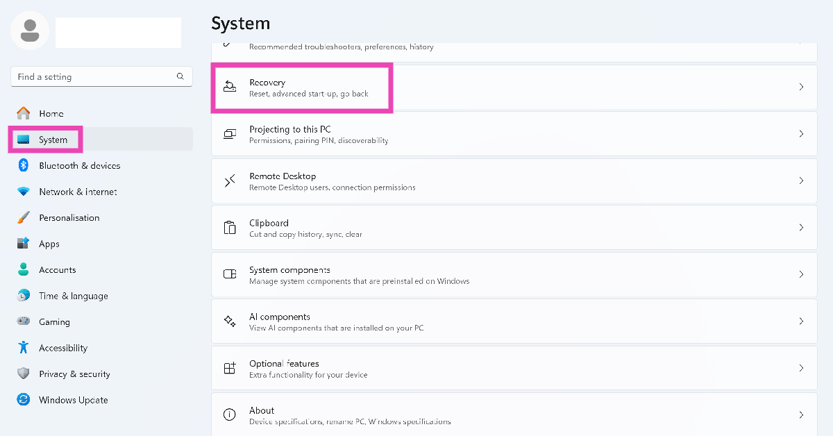 ステップ1:行きます設定選択しますシステムサイドバーから。