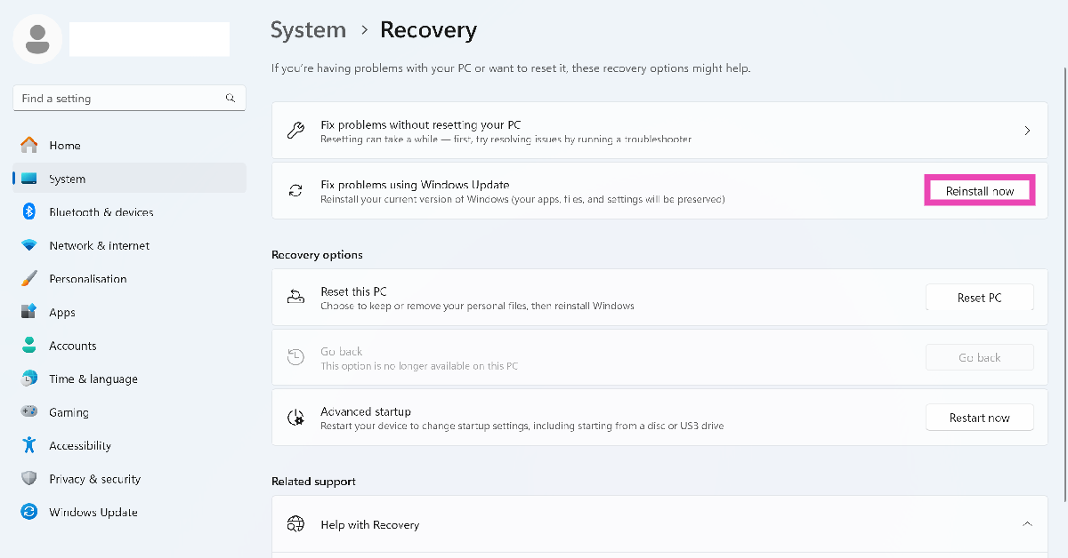 行きます[設定]> [システム]>リカバリ「今すぐ「今すぐ再インストール」をクリックします。「Windows Updateを使用して問題を修正」します。