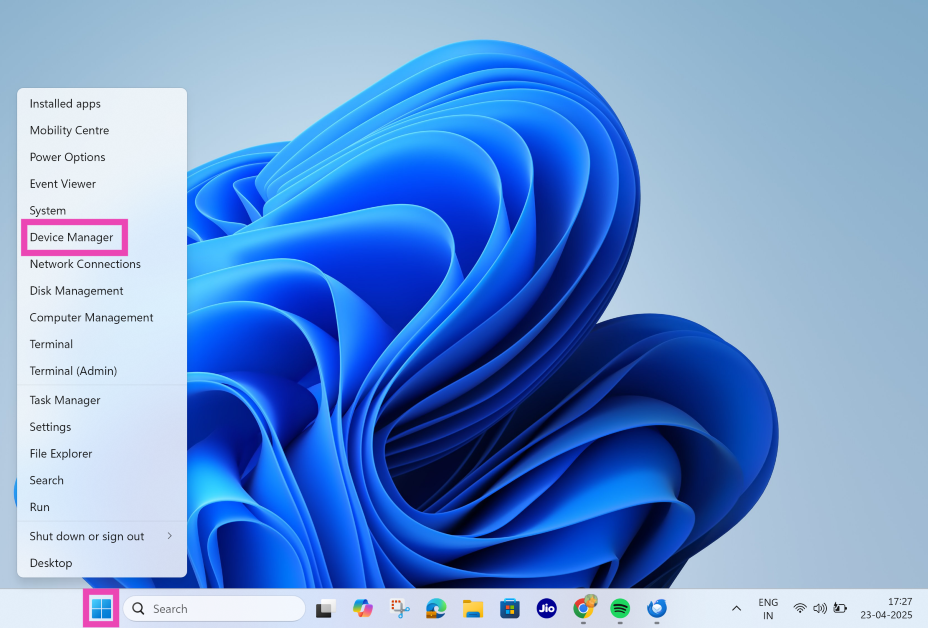ステップ1:右クリックしますWindowsアイコンタスクバーでクリックしますデバイスマネージャ。