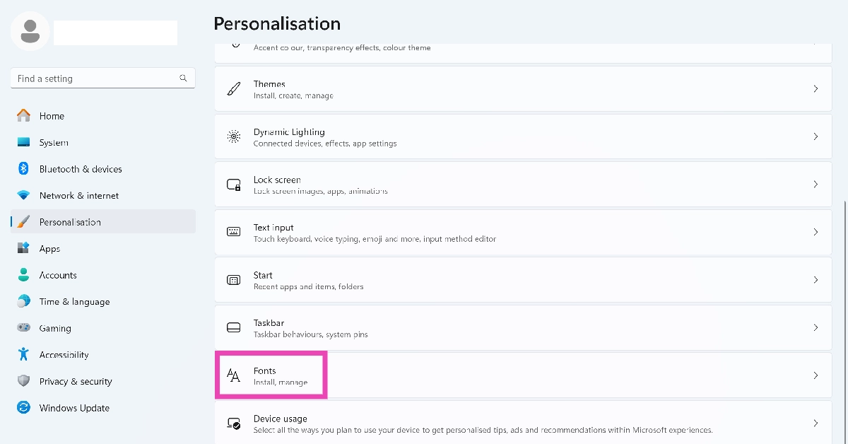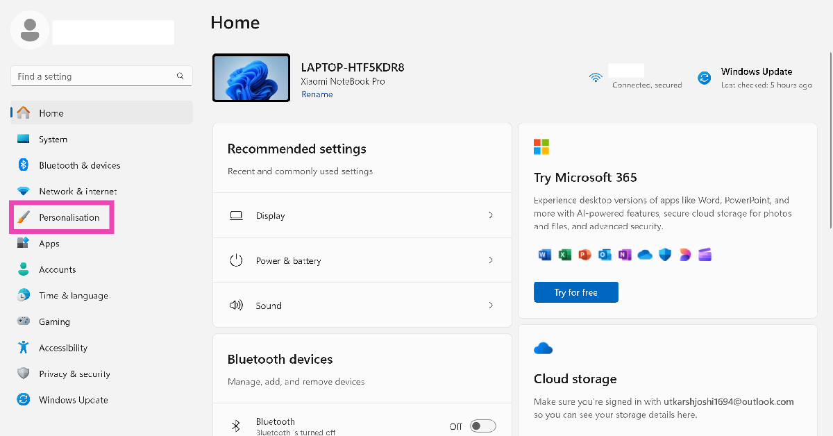 ステップ1:行きます設定選択しますパーソナライズサイドバーから。