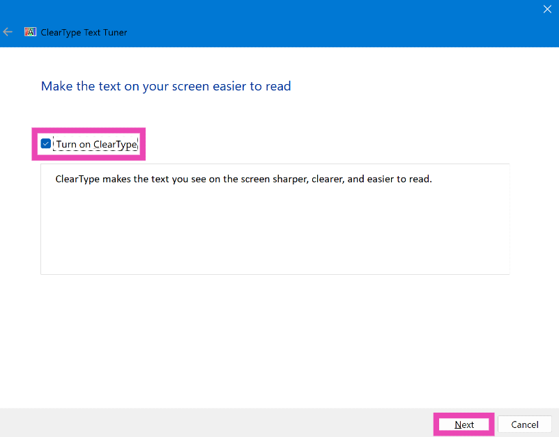 ステップ5:次のチェックボックスを押しますClearTypeをオンにしますクリックします次。