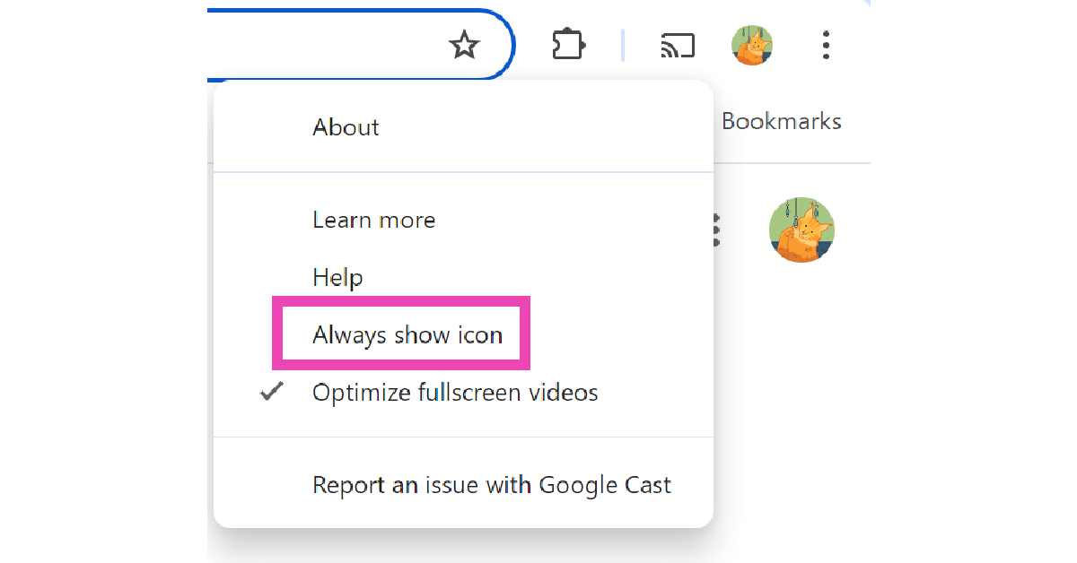 画面の右上隅にある楕円を押し、「キャスト、共有、保存」の上にカーソルをホバリングし、キャストを選択します。画面にアイコンがポップアップ表示されたら、右クリックして[常に表示]を選択します。