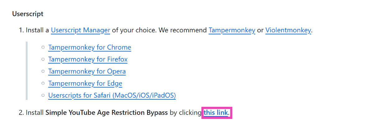 ステップ2:に行きます簡単なYouTube年齢制限バイパスページgithubで下にスクロールしますユーザースクリプトセクション。
