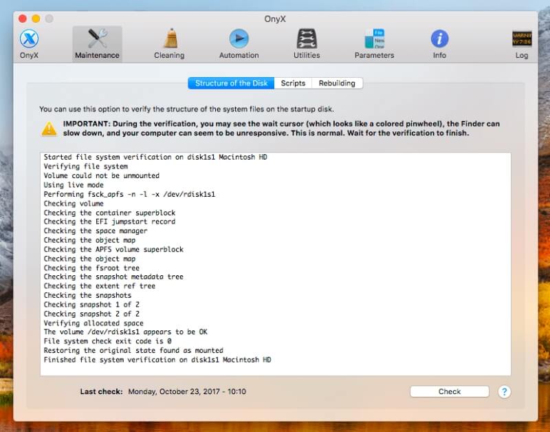 オニキス技術的なユーザーにより適した強力なフリーウェアユーティリティです。アプリの使用方法を学ぶのに時間がかかり、最初にソフトウェアを使用するときは、スタートアップディスクを検証する間、Macが約10秒間反応しなくなります。