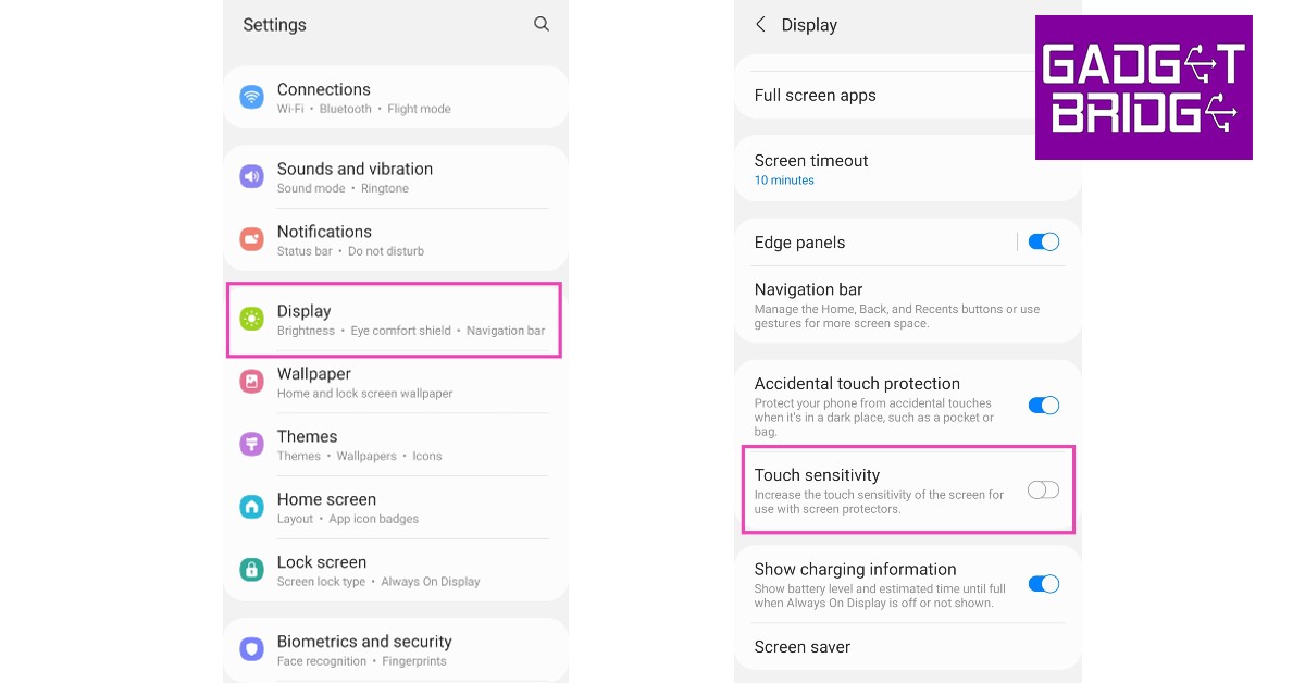 画面プロテクターを削除したくない場合は、画面のタッチ感度を高めるために、機能させることができます。感度が高まると、携帯電話のタッチスクリーンは、画面プロテクターが邪魔をするために気付かれないかすかなタッチを拾うことができます。行きます設定>表示タッチ感度のためにトグルバーをオンにします。