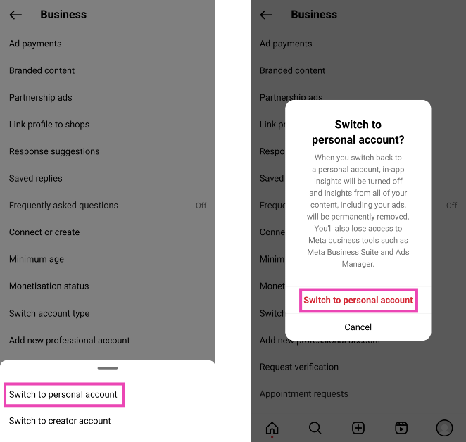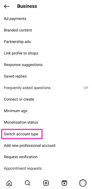 アカウントの種類をビジネスから個人または作成者に切り替える