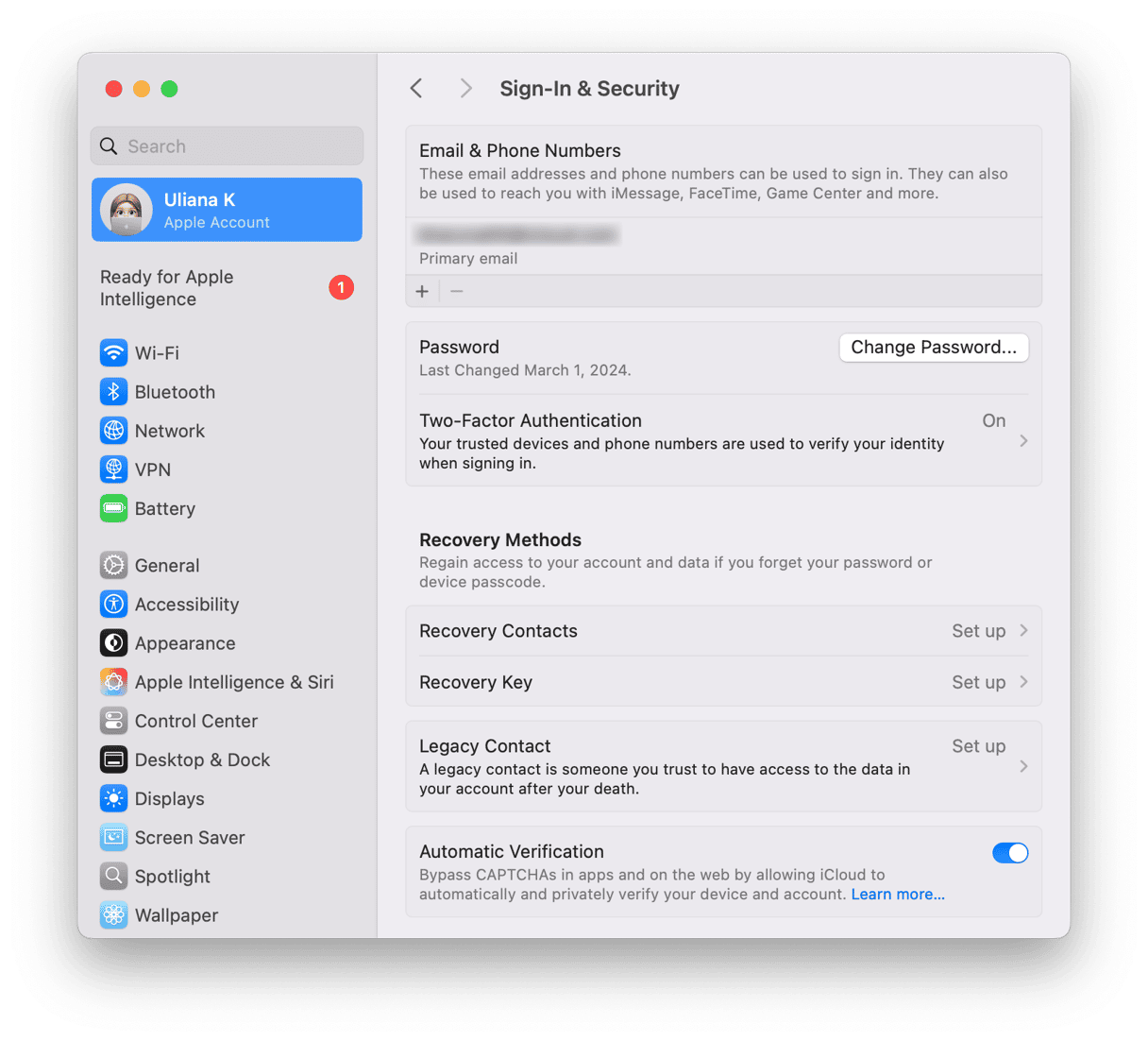 - サインインおよびセキュリティセクションで、Appleアカウントに移動してクリックします。