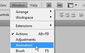 これで、開く必要がありますアニメーションウィンドウ、クリックして行うことができますウィンドウPhotoshopの上部にあるメニュー、クリックしますアニメーションオプション。アニメーション窓は、Photoshopの下部にある水平窓として開きます。