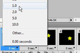 右側の下向きの矢印をクリックします0秒そして、あなたのフレームの1つの下でアニメーションウィンドウ、次に、そのフレームをアニメーションGIFに表示する時間を選択します。画像のフレームごとにこのステップを繰り返します。私は選ぶのが好きです1.0Photoshop CS5の多くのアニメーションGIFのフレームの期間は、あなたに最適なものを見つけるまで、さまざまな期間を試してください。