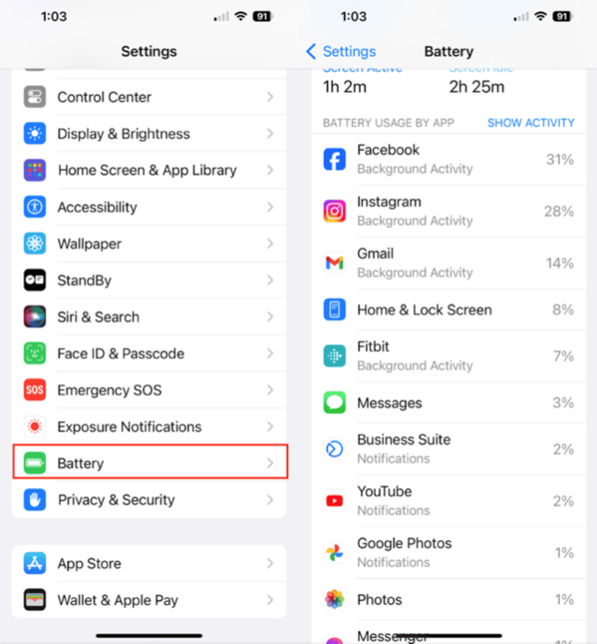 - バッテリーの使用量を確認してください。 [設定]> [バッテリー]に移動して、iPhoneで最もパワーを消費するアプリを確認します。それらのアプリを開いたり、スワイプしたり、スワイプの中央を一時停止したり、再びスワイプして閉じたりすることで、これらのアプリを閉じることができます。