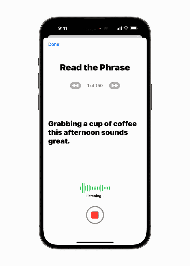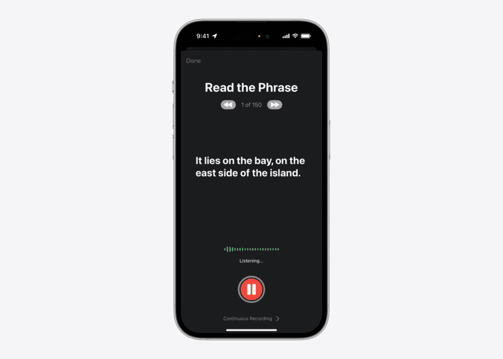 個人的な音声を作成するには、ユーザーは自分自身を記録して、ランダム化されたテキストのセットを約15分間読んでいます。この機能は、デバイス上の機械学習を利用してこのデータを処理し、ユーザーの自然な音声によく似た一意の音声モデルを生成します。