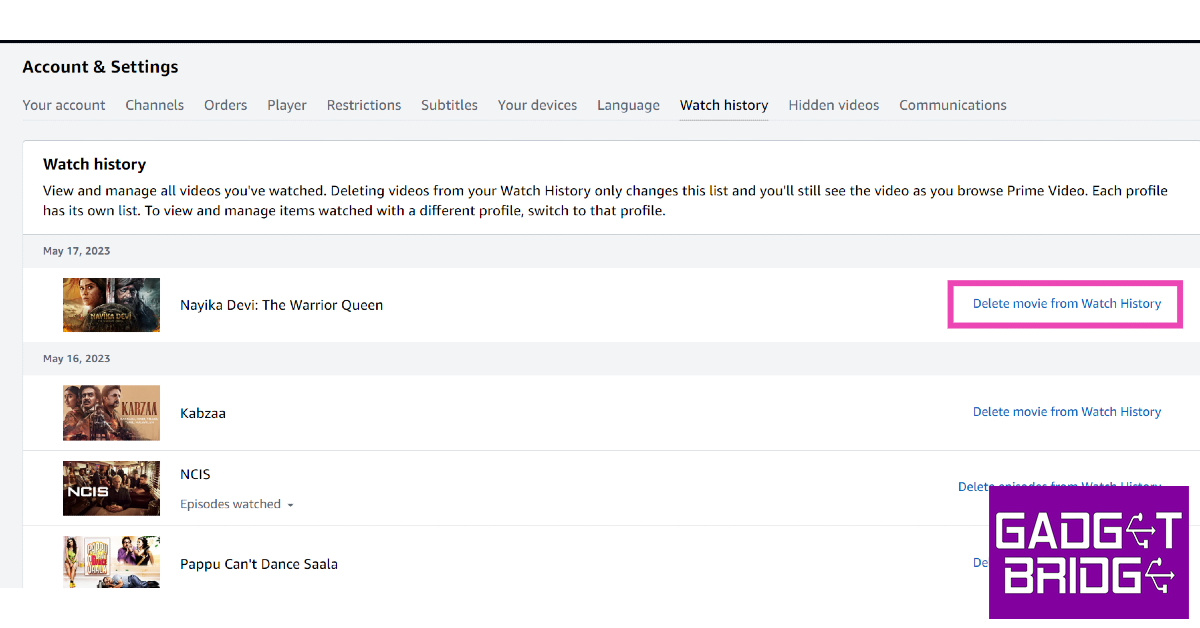 Webサイトを使用して、プライムビデオアカウントの時計履歴のみをクリアできます。プライムビデオアカウントにログインして移動しますアカウントと設定>ウォッチ履歴特定のタイトルを削除します。