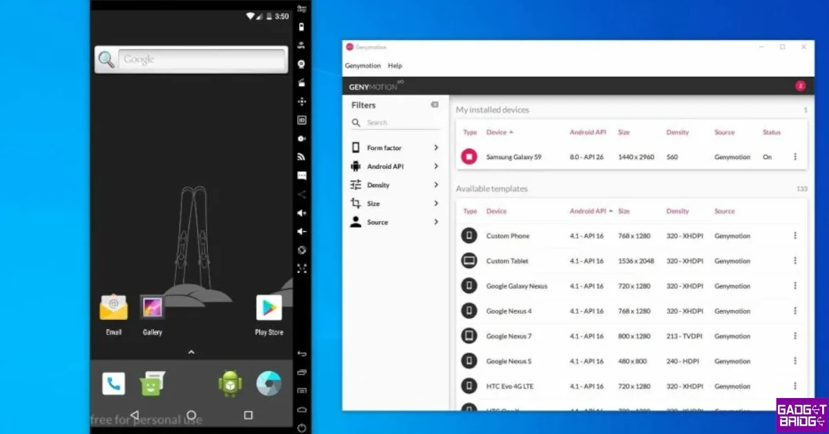 GenymotionとともにVirtualBoxをダウンロードしてから、アカウントを作成します。個人使用機能を選択します。テンプレートのリストから選択をインストールした後、画面解像度を決定し、Androidバージョンとリソースに蓄積され、目的のテンプレートをインストールします。これで、Open GappsアイコンをクリックしてPlayStoreを追加して、お気に入りのゲームをダウンロードして再生できます。