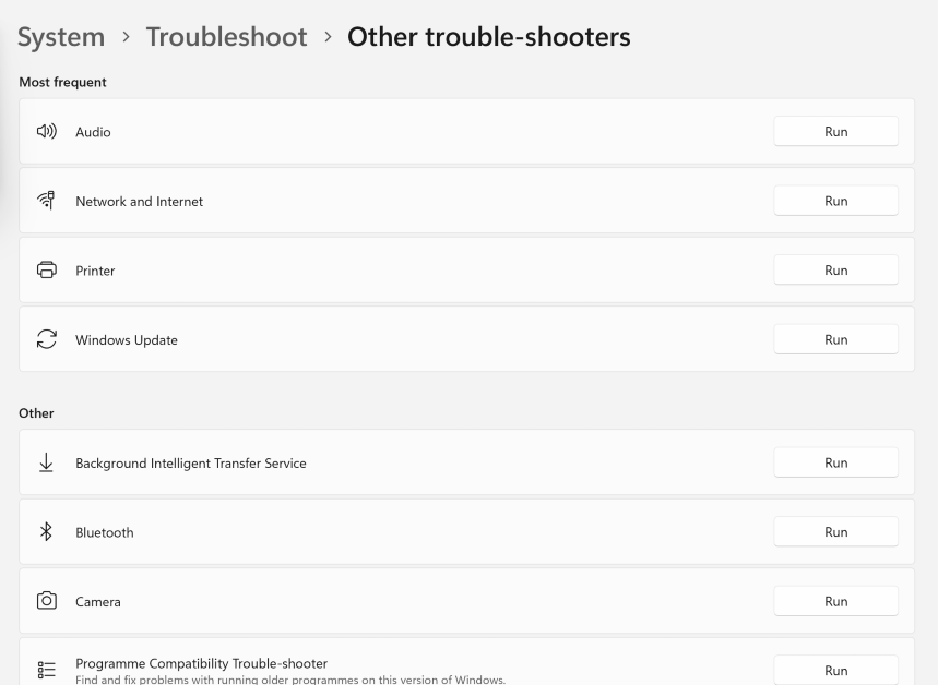 行きます設定>システム>トラブルシューティング>その他のトラブルシューター問題に直面しているコンポーネントの横にある[実行]をクリックします。