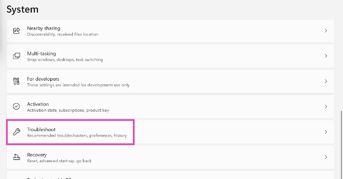 ステップ2:下にスクロールしてクリックしますトラブルシューティング。